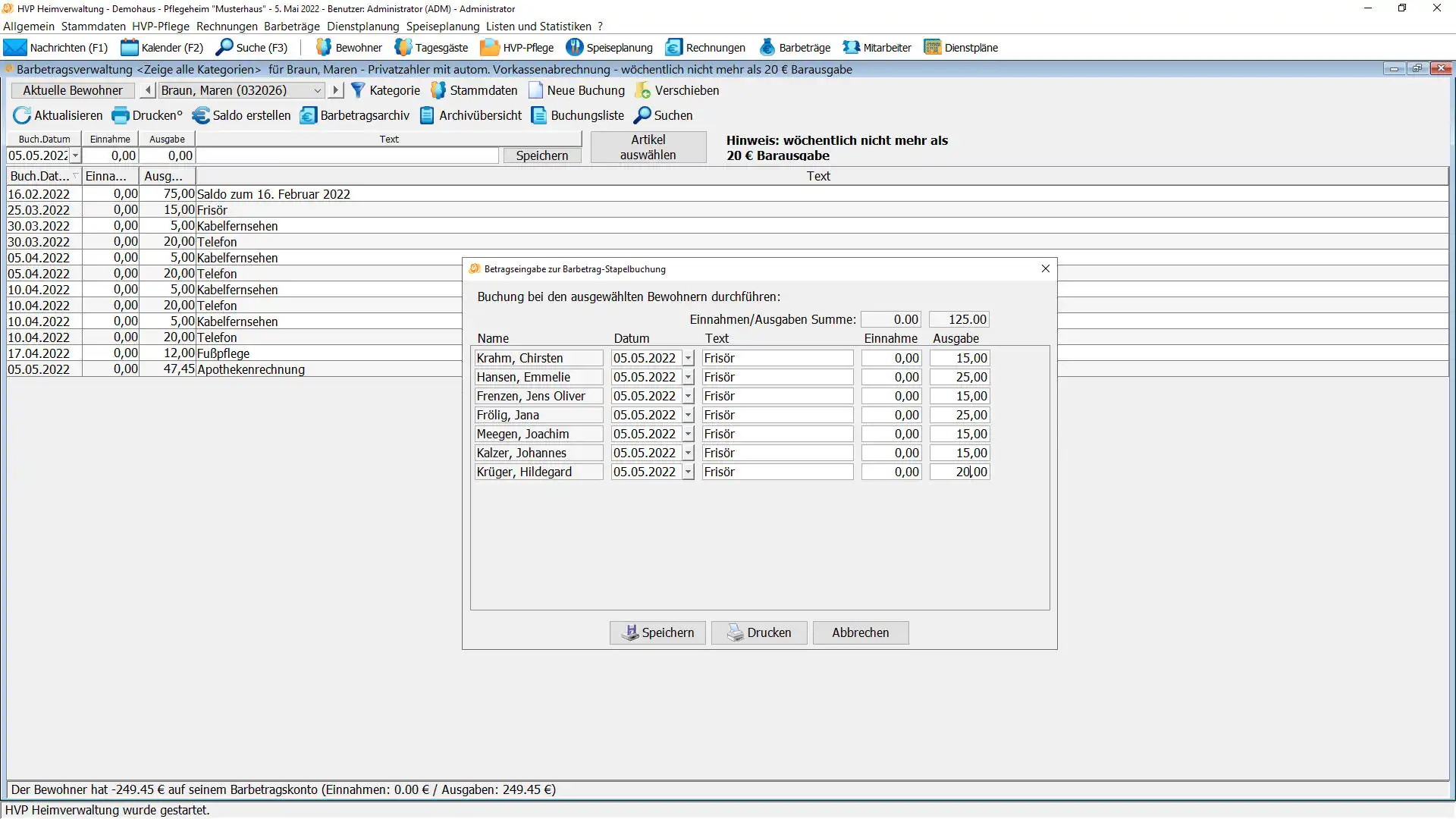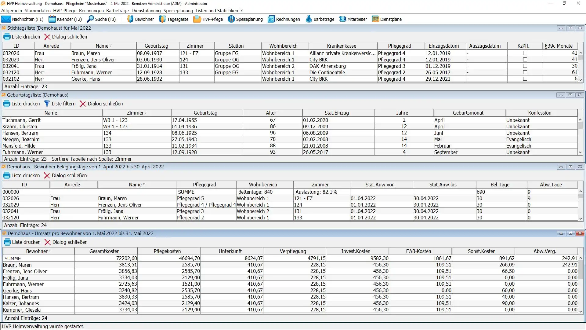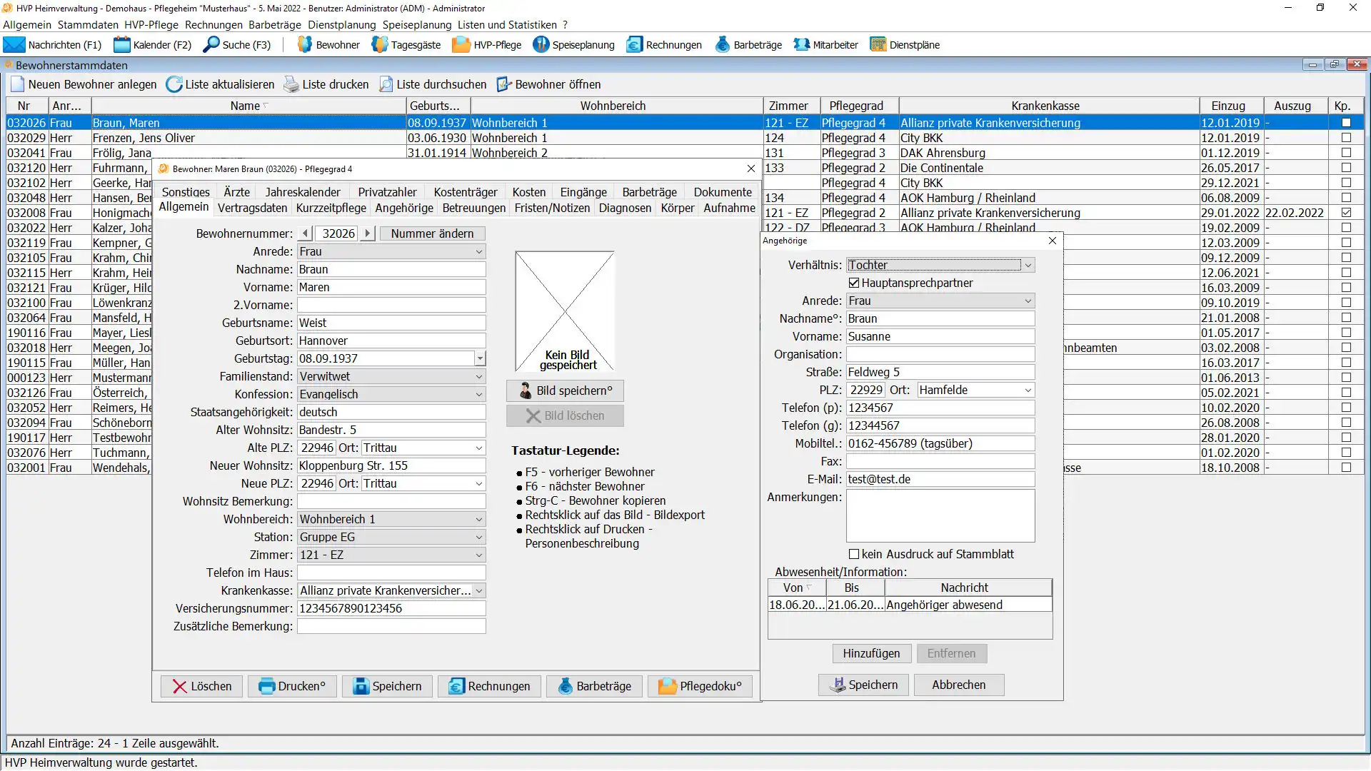 - Listen zu Angehörigen, Ärzten, Geburtstagen, Abwesenheiten, Betreuungen, Fristen, freien Zimmern, etc.